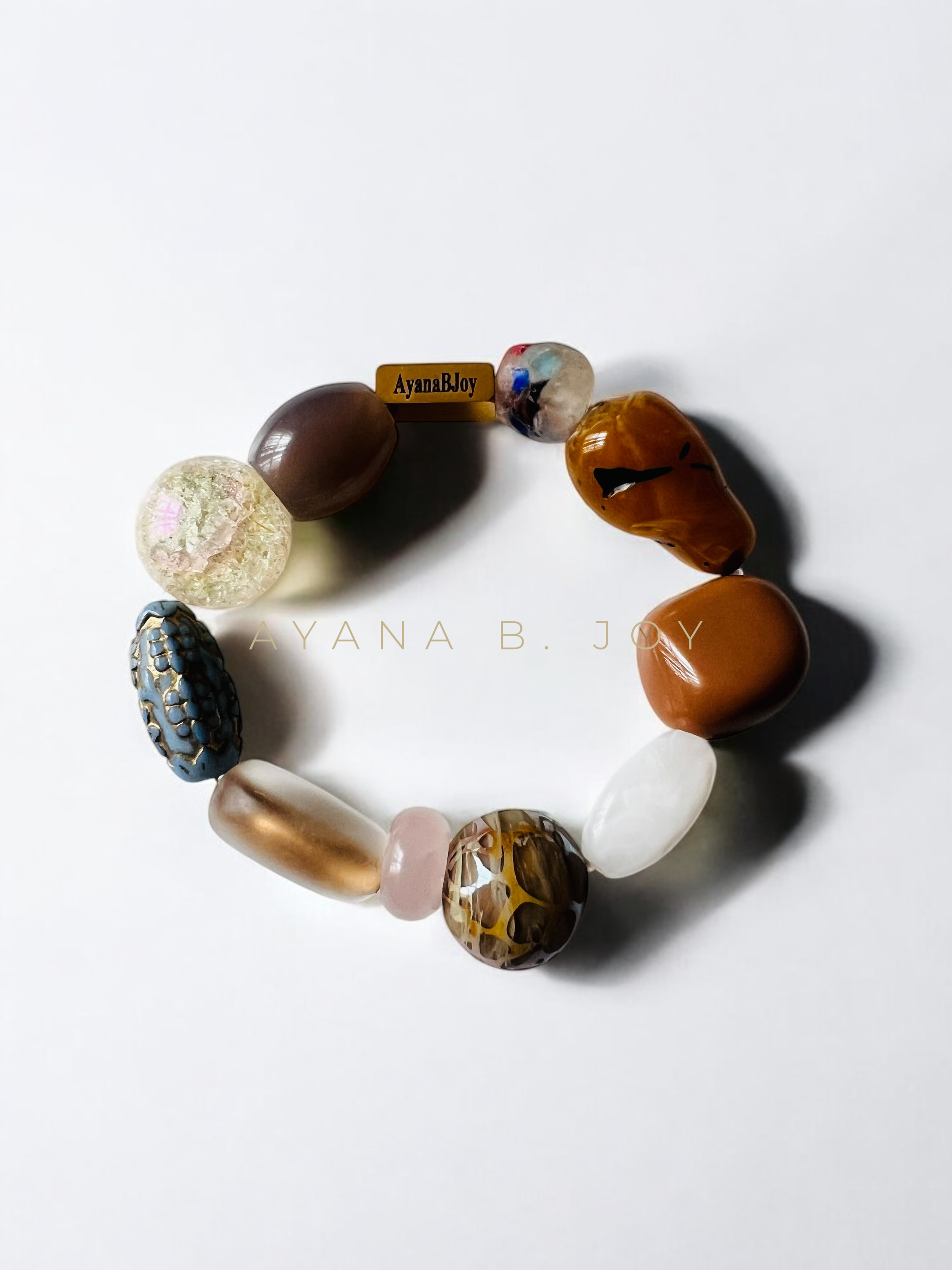 Mé·lange Beads Bracelets are a stunning blend of one-of-a-kind, hand-sculpted glass focal beads featuring a sandblasted technique with metallic designs. These bracelets also incorporate vintage acrylic beads, along with amethyst, rose quartz stones, and a sparkling confetti bead for a unique touch.